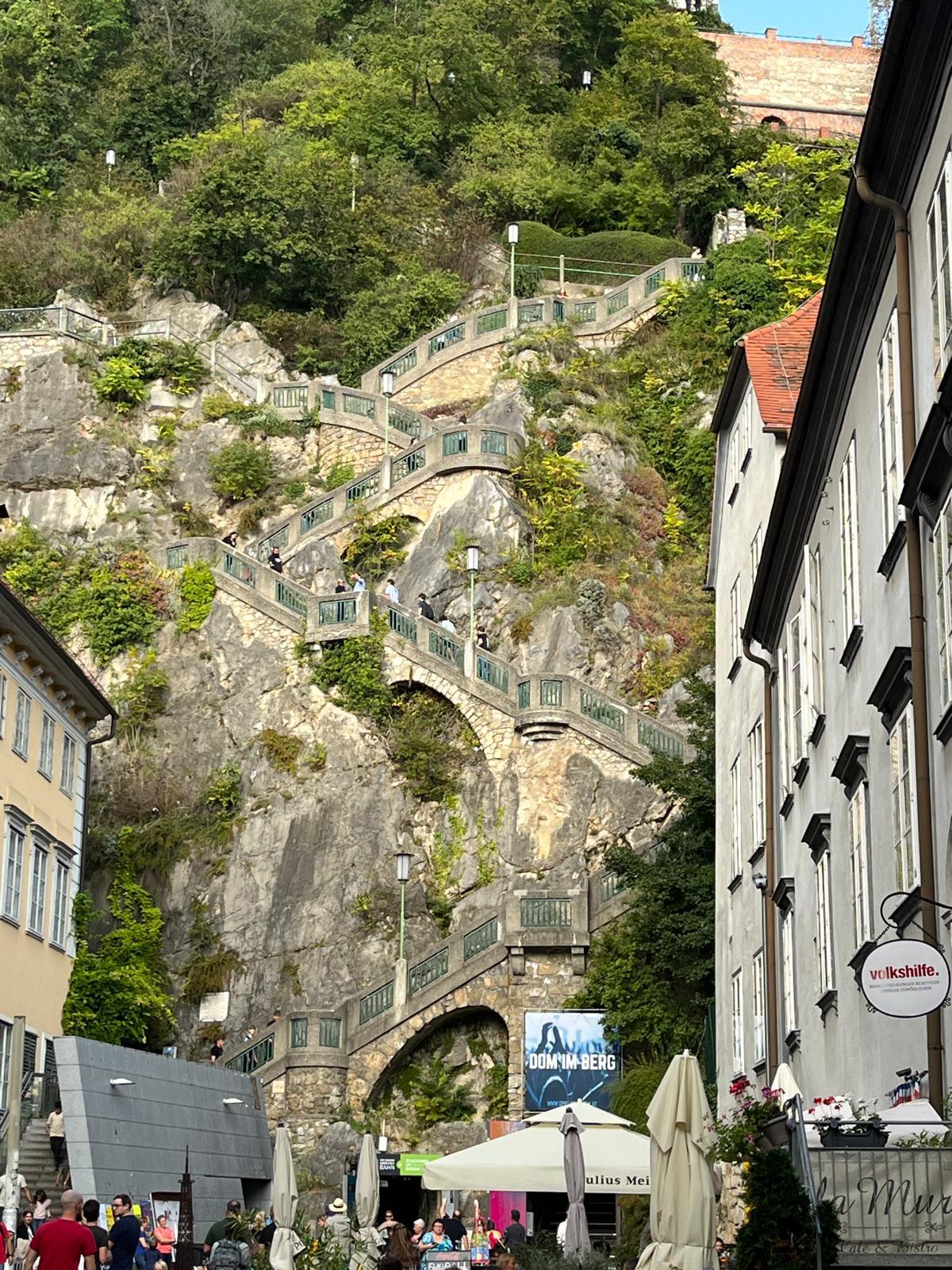 Am Nachmittag trafen wir uns mit unseren Lehrern, um das faszinierende Stadtzentrum zu besichtigen, aber auch um durch die Läden zu bummeln. Während unseres Aufenthalts besuchten wir zudem mehrere Sehenswürdigkeiten wie Schloss Eggenberg oder den Schlossberg. Wir wanderten außerdem durch die Rettenbachklamm, die uns bei den noch sehr sommerlichen Temperaturen etwas Abkühlung bot. Unsere erste Woche endete mit einem leckeren Abendessen in unserem Air BnB, danach reisten Frau Strunz und Herr Schuster ab.